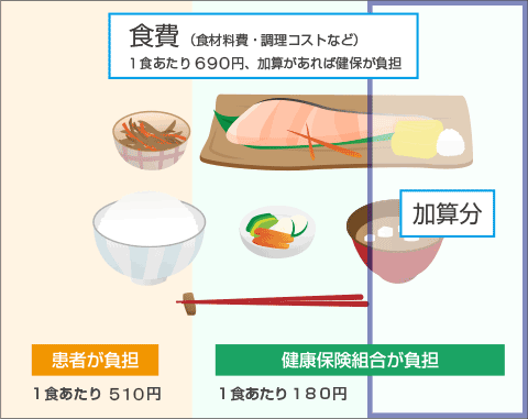 入院したときは、食事にかかる費用として1日3食を限度に1食あたり510円(市町村民税非課税者の場合は110~240円)の標準負担額を自己負担し、標準負担額を超えた分は、入院時食事療養費として健康保険組合が負担します。標準負担額は被保険者・被扶養者ともに同額で、高額療養費の対象にはなりません。