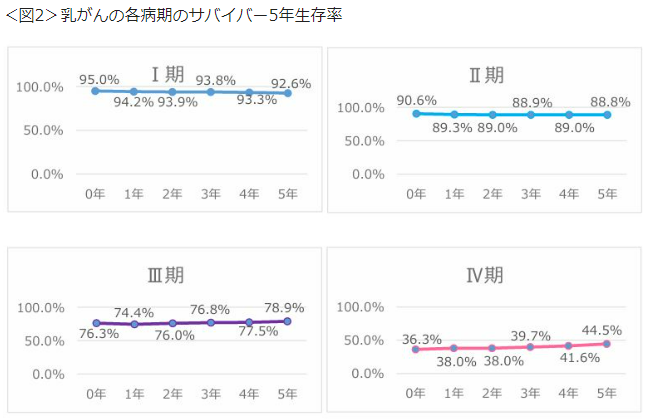 本報告によると、治療による根治がより期待できる病期(I・II期)では、多くのがん種でサバイバー5年生存率はほぼ横ばいになりますが、進行期(III・IV期)では1年生存するほど5年生存率が改善する傾向がみられました(例:図1)。その一方で「乳がん」は、どの病期でもサバイバー5年生存率はほぼ横ばいであることから、長期の治療と経過観察が必要なサブタイプがあることを反映していると推測されました(図2)。