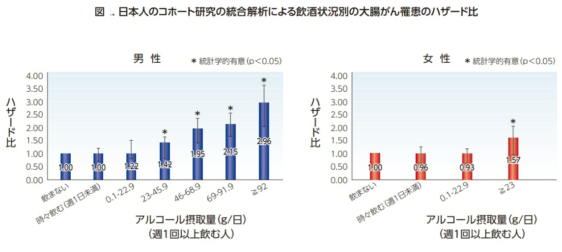 → 日本人において、飲酒も、「確実」に大腸がんのリスクを上げる、と評価されています。機序としては、アセトアルデヒドや活性酸素の発がん性が示唆されています。