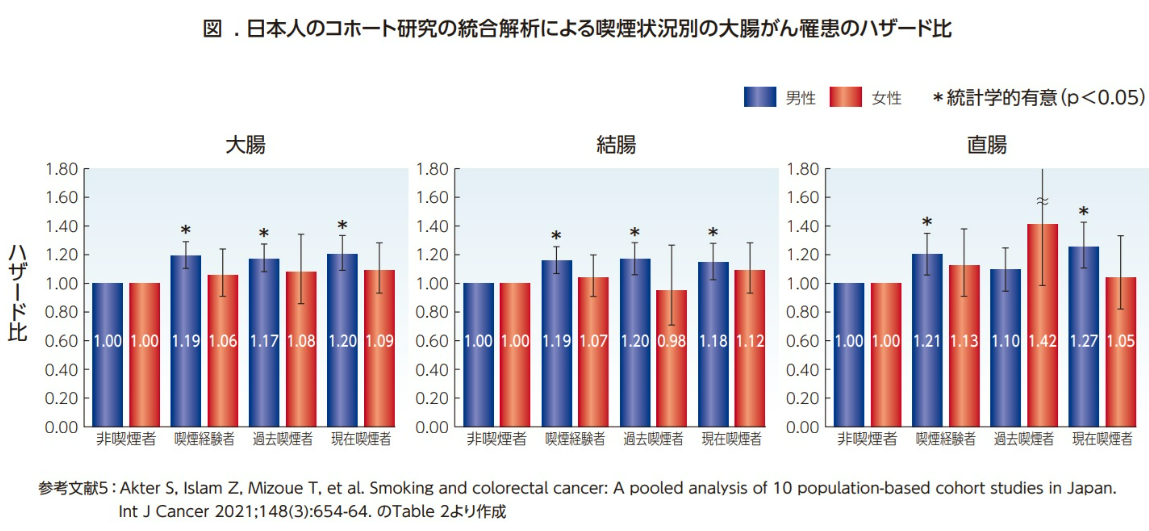 → 喫煙により、日本人における大腸がんのリスクが上がることは「確実」と評価されています。10件の日本のコホート研究を統合した解析では、1日あたり20本以上の喫煙で男性では20%、女性で40%大腸がん罹患リスクが増加するという結果でした。
