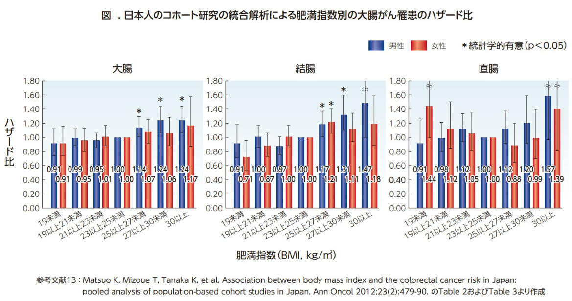 → 日本の肥満による大腸がんの罹患リスクの増加は「ほぼ確実」とされています。日本の8つのコホート研究を統合した研究でも、BMIの上昇とともに大腸がんのリスクが増加し、とくに男性では、BMIが25kg/㎡以上で顕著でした。