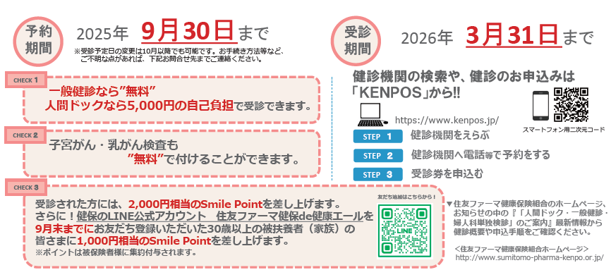 健診対象の被扶養者の方へお知らせ 2025年04月25日 今年も欠かさず健康チェック! 予約受付中です。 健保から 受診案内ハガキが届く前でも あるいは 届かなくても、対象条件に合う被扶養者の皆さまはご利用できます。 次の記事へ前の記事へ