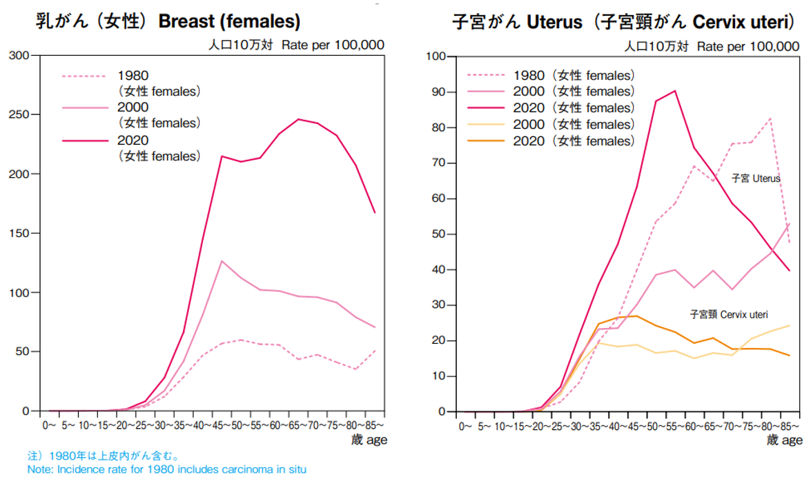 本邦では、女性に特有のがんである「乳がん」および「子宮頸がん」については、比較的若年から罹患を認め、近年増加しています(図2)。