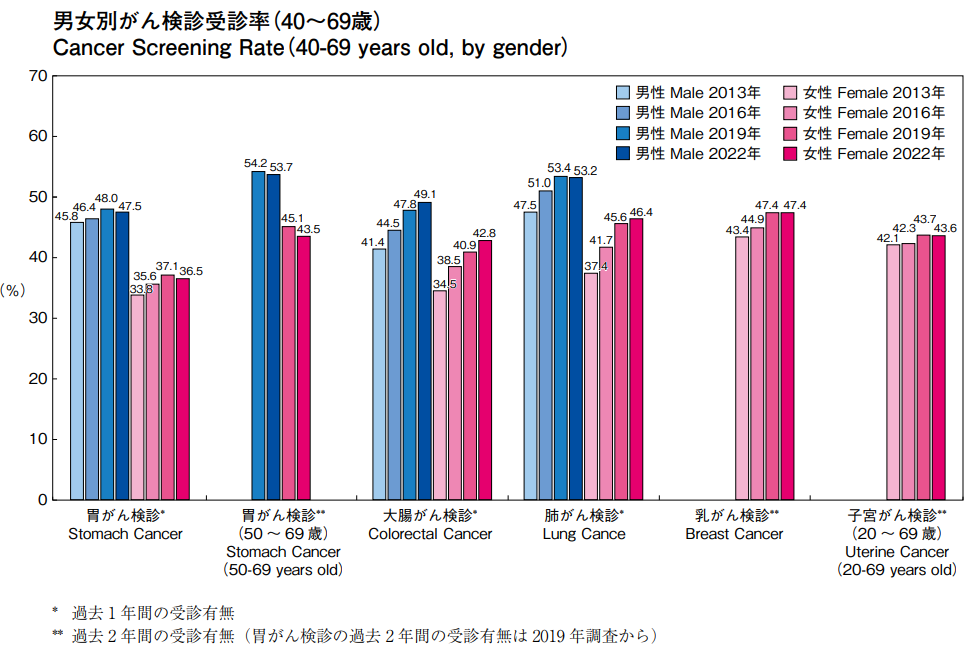 5/9、 「がんの統計2025」(がん研究振興財団)が公表されました。本データによりますと、全国の がん検診受診率(過去2年間)については、乳がん:47.4%、子宮がん:43.6% 等でした(図1)。一方、長期に未受診の方もいらっしゃるものと察します。