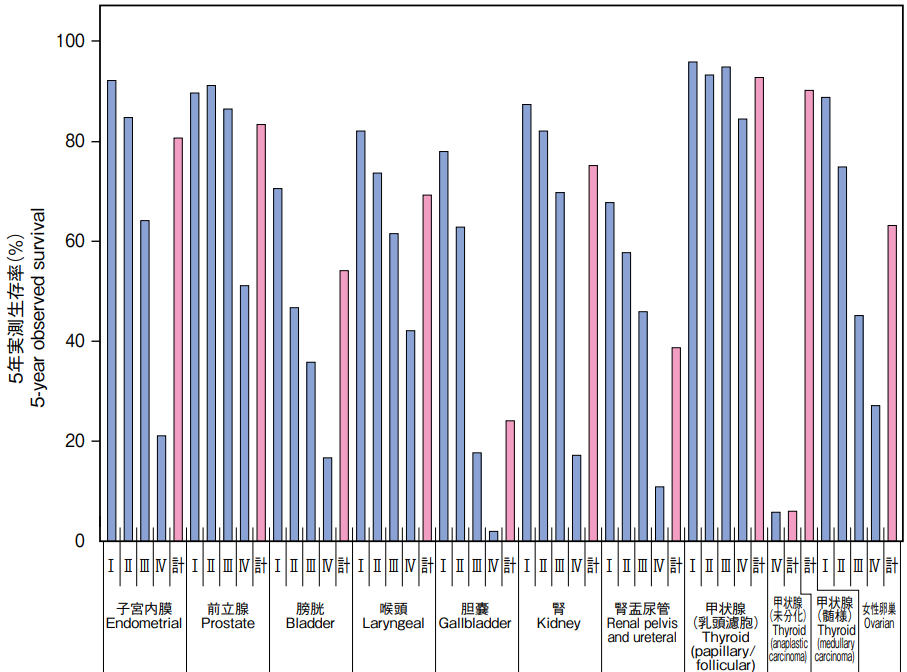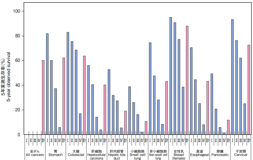 総合病期(UICC TNM分類総合ステージ)別5年実測生存率 男女計