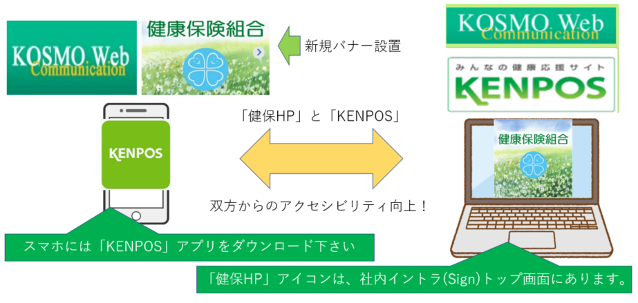 「KENPOS」のトップページ上部に、「KOSMO Web」及び「健保ホームページ」のバナーを設置致しました。