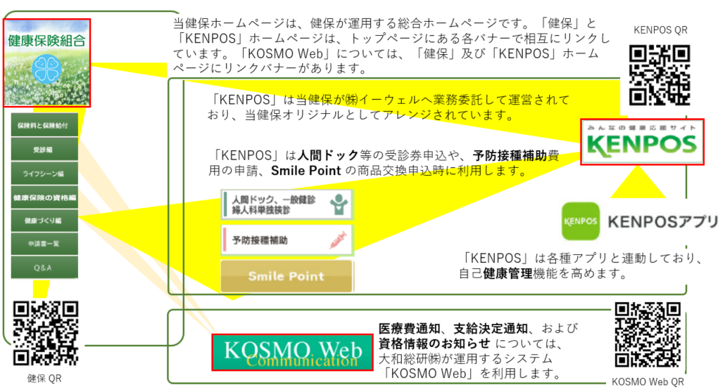 ▽ 「健保HP」と「KENPOS」、「KOSMO Web」の関係図